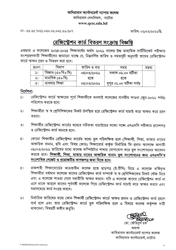 ২০২৪-২০২৫ শিক্ষাবর্ষের রেজিস্ট্রেশন কার্ড বিতরণ সংক্রান্ত বিজ্ঞপ্তি